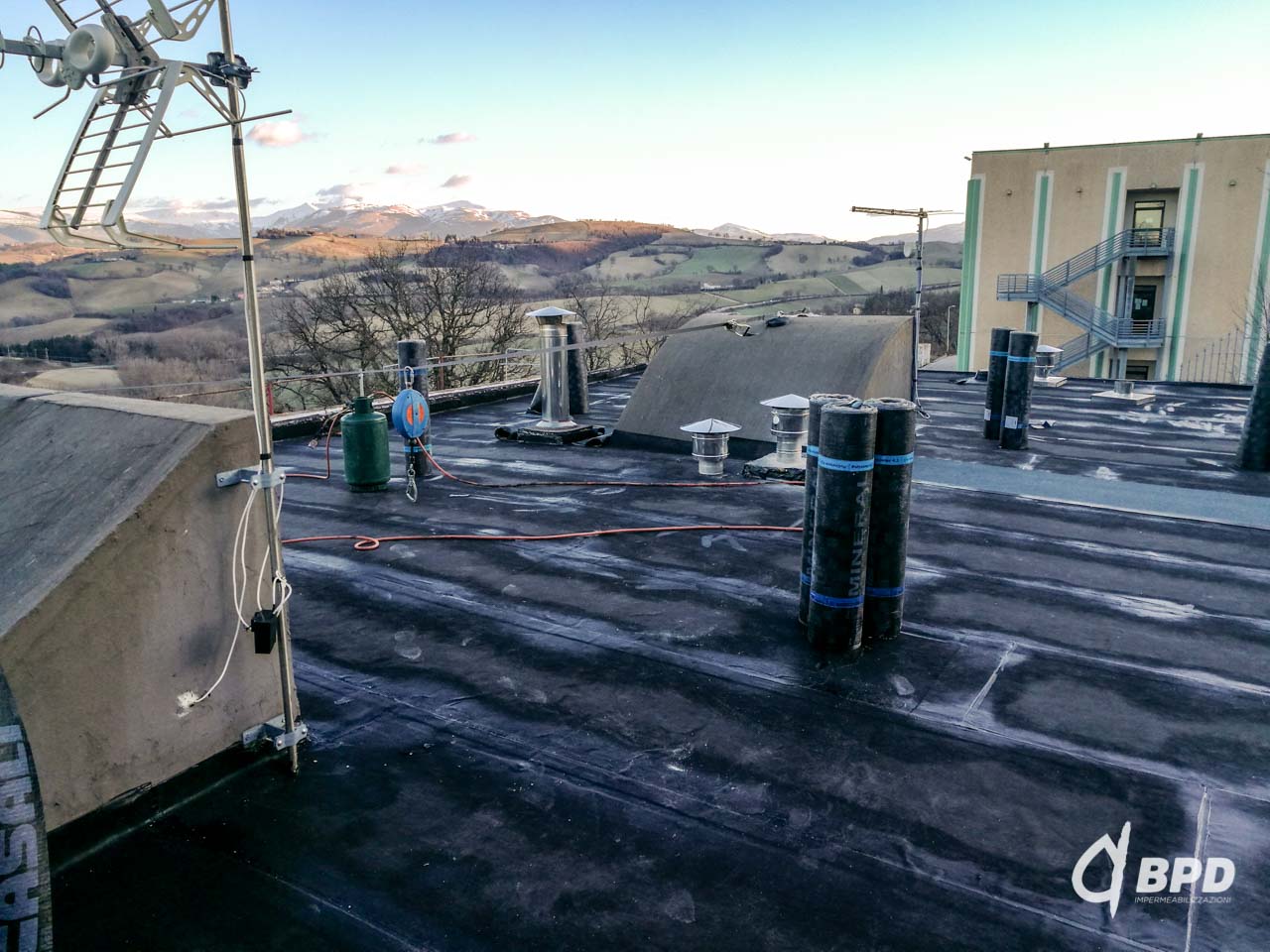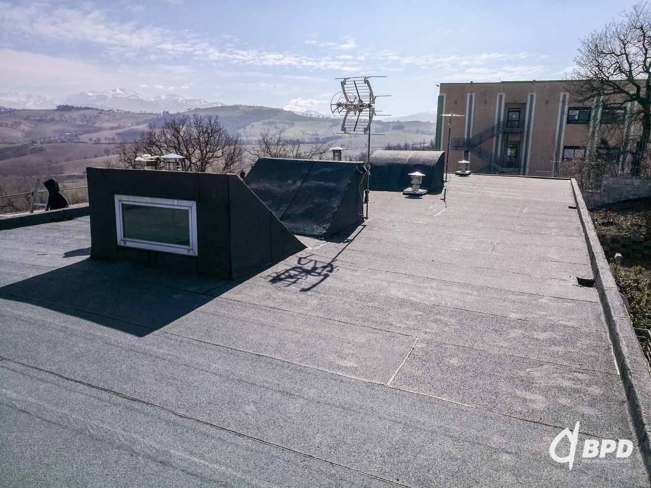 Per gli alloggi della Guardia di Finanza siamo intervenuti nello smantellamento del vecchio manto impermeabile. Inoltre abbiamo lavorato nella posa dell’isolante e posa primo strato di guaina termo-adesiva e posa guaina ardesiata di finitura.